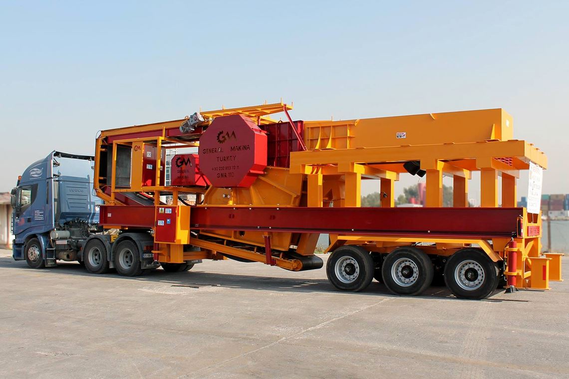 La Planta de GNR - MC110 Trituradora Móvil de Mandíbula incluye un grupo de trituradora móvil de mandíbula de 110 mm con un alimentador móvil que puede operar de forma independiente, una trituradora móvil de impacto DMK 03 y el grups de cribas móviles vibratorias.