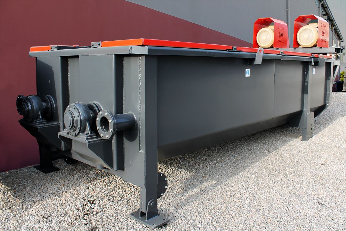 L'excès d'eau dans le système est évacué par les goulottes d'évacuation avant de dépasser le niveau autorisé par l'angle de travail déterminé dans l'installation de la machine. Si vous le souhaitez, les dépenses en eau dans le système peuvent être réduites au minimum grâce à la pompe de circulation en option.