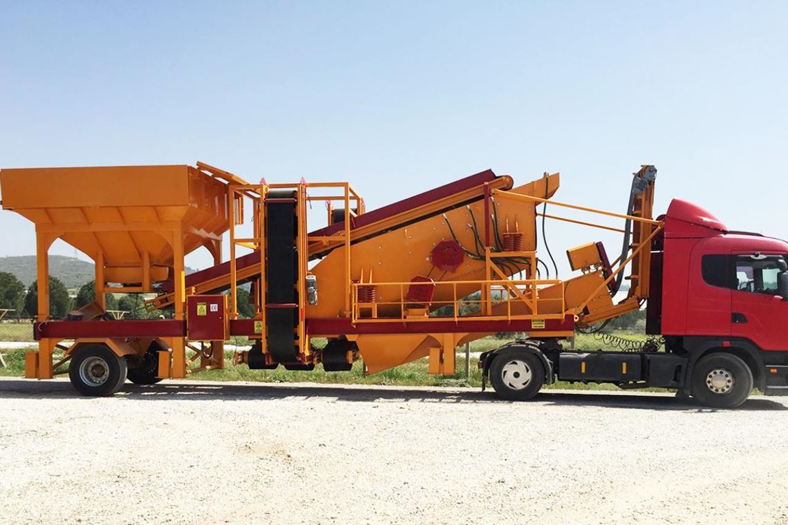 Материал, загружаемый в камеру с ковшом, переносится лентой на грохот, а просеянный материал отделяется и выливается в складские помещения из лент побочных продуктов. В местах, где нет линии электропередач, они также могут работать с помощью установленного на объекте генератора.